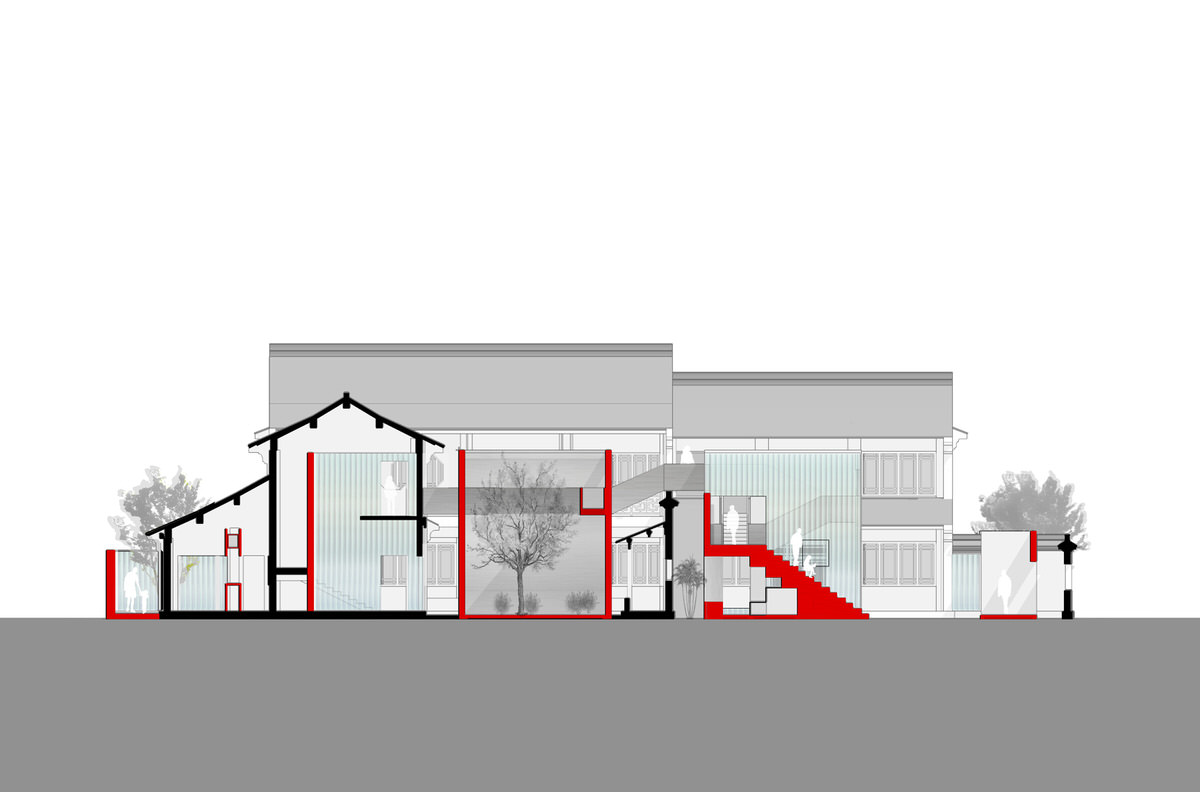 Although this concept was very critical of the archaizing trend, the exterior appearance of the building could do nothing but follow this style required by the urban planning. Therefore, it was a design for inward reconstruction. The northern façade was the only exception, where a full-height window was arranged on F2, indicating an old, heartbreaking story of a princess from Kingdom Qi. Allegedly, Qi Gateway was located on this site during the Spring and Autumn Period (approximately from 771 to 476 BC), where a princess from Kingdom Qi of North China, who was married to a prince of Kingdom Wu (nowadays in Suzhou) looked out every day her homeland. Directed by the spatial sequence, visitors will automatically look out North as the princess used to do. At this moment, the present behavior echoes with historic happening.