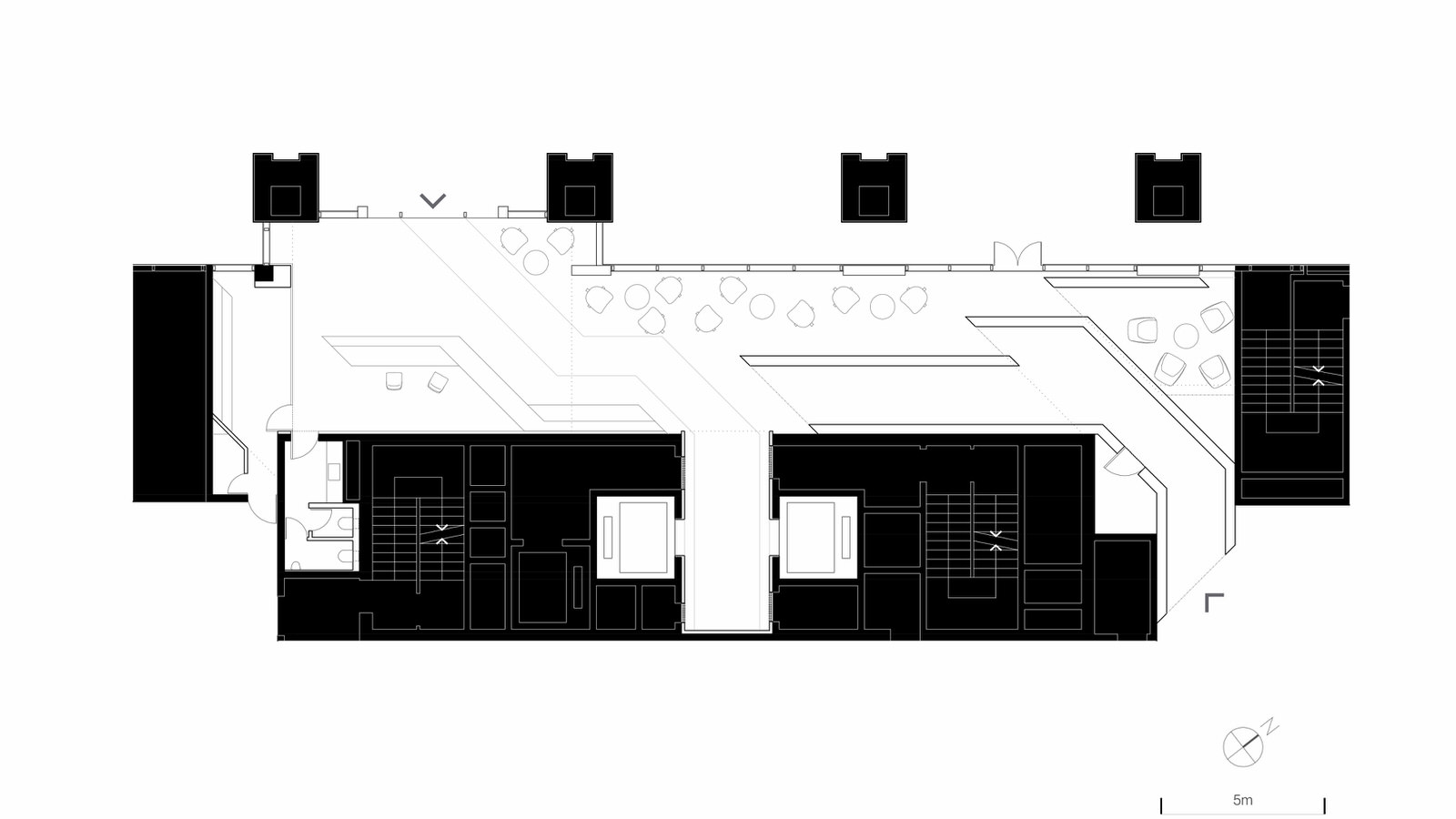The sales office is located at the apartment entrance on ground floor, where the future apartment lobby and Café are located as well. Temporary sales function is folded into a string of boxes, replacing conventional sand table and promotion pamphlets by using laser projection, AR and VR techniques. The sales office is located on the end of the box string.