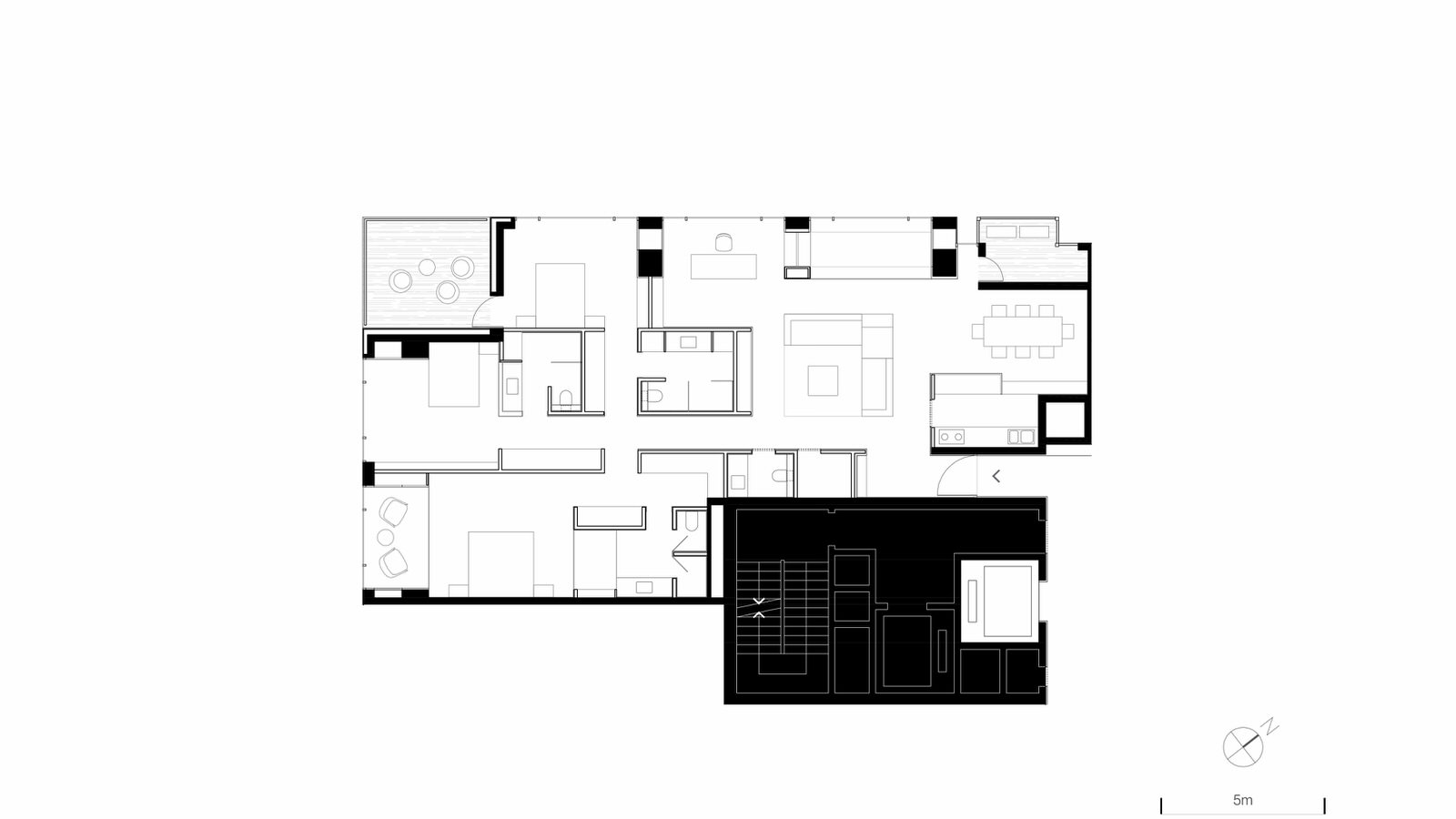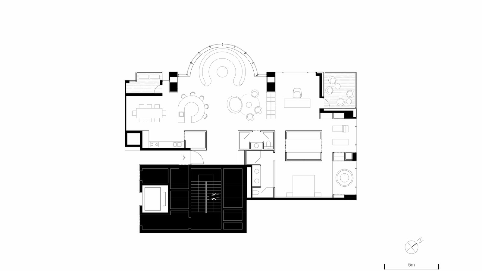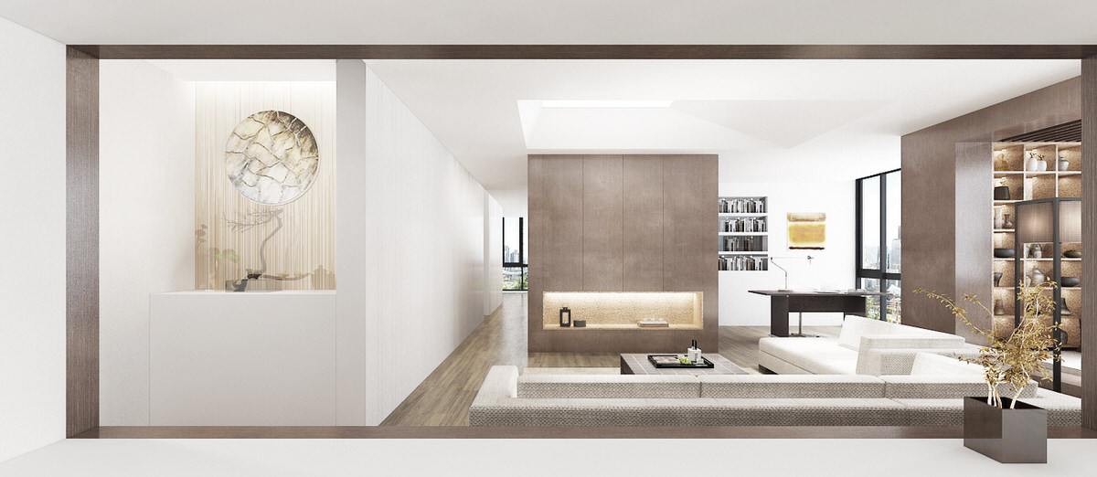 Originally designed for large-scaled offices, an apartment has an area more than 200 m². The client required two completely different styles of layout. Layout A1 consists of 3 suites with independent bathrooms and cloakrooms, which could be used as a sharing flat. Separable sharing areas included living room, study, tea room, dining room and kitchen. It could also be used as a generation apartment, accommodating more generations of a big family under one roof. The layout A2 is a business apartment, offering a multi-functional space for living, party and meeting in a nutshell. While the cross-shaped sharing space keeps as transparent as possible for meetings and reception, private rooms is established with tailored service areas like SPA terraces. The round image used in interior space was inspired by Portman design, for example, the interior design in living rooms corresponds harmoniously with the semi-circled overhang of the building.
