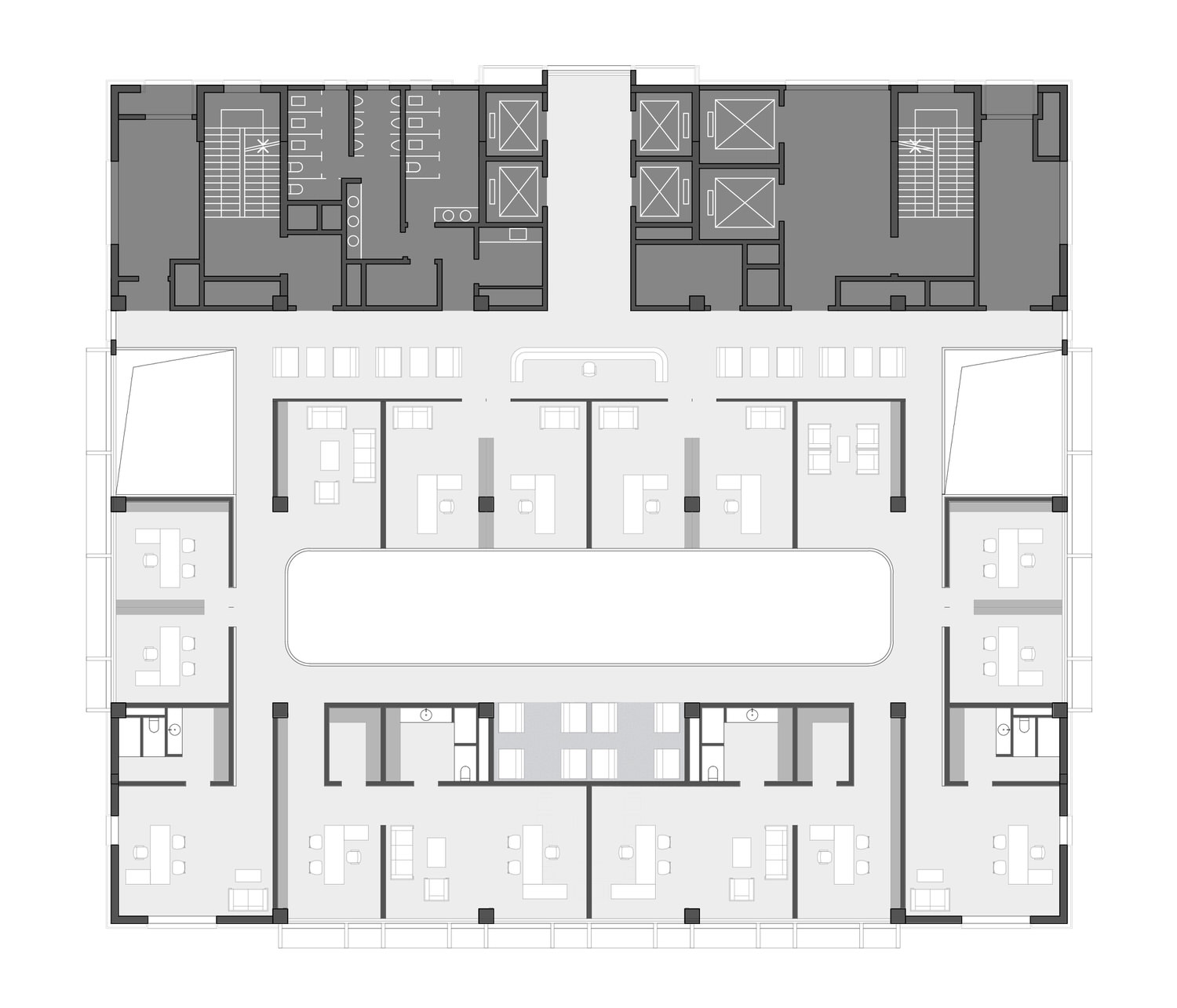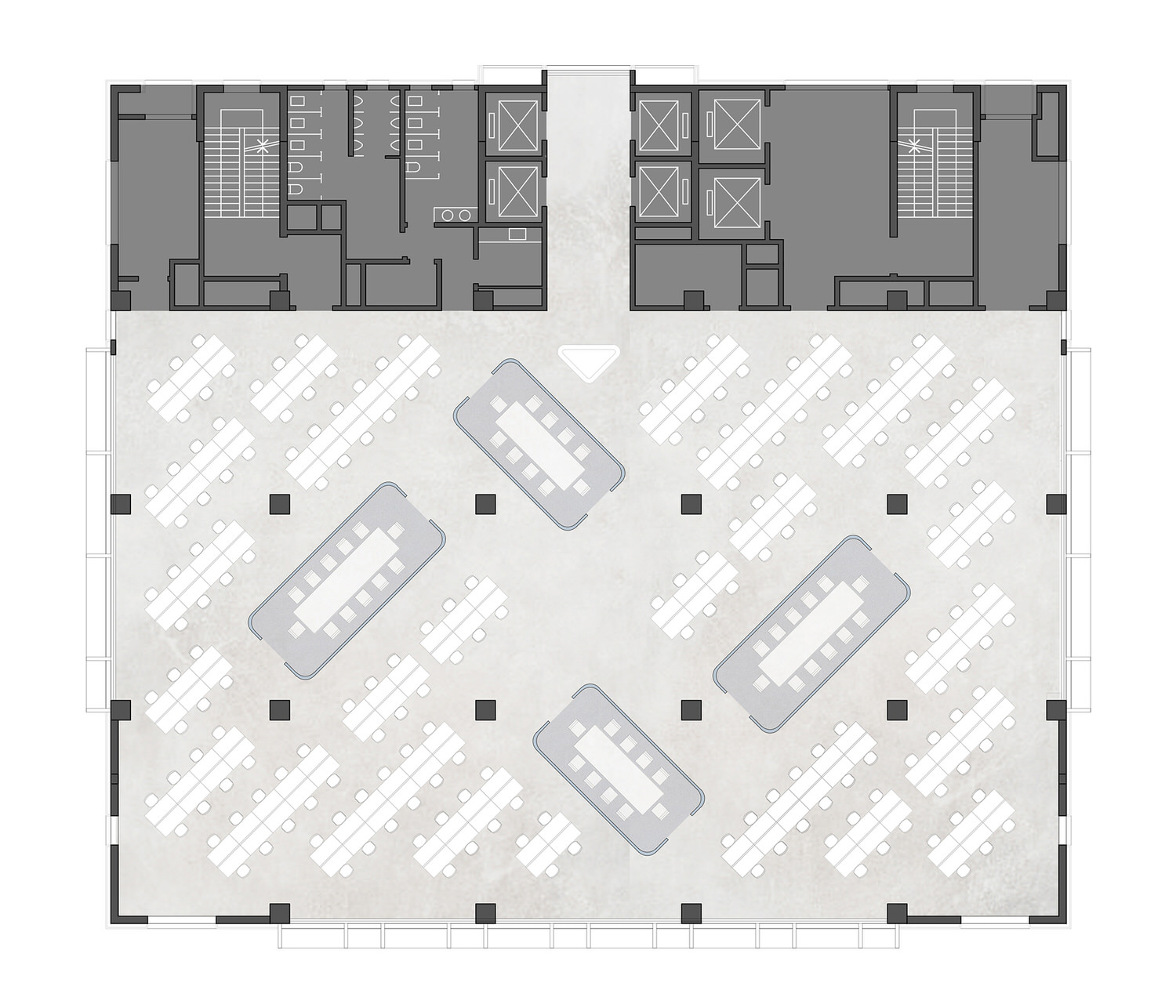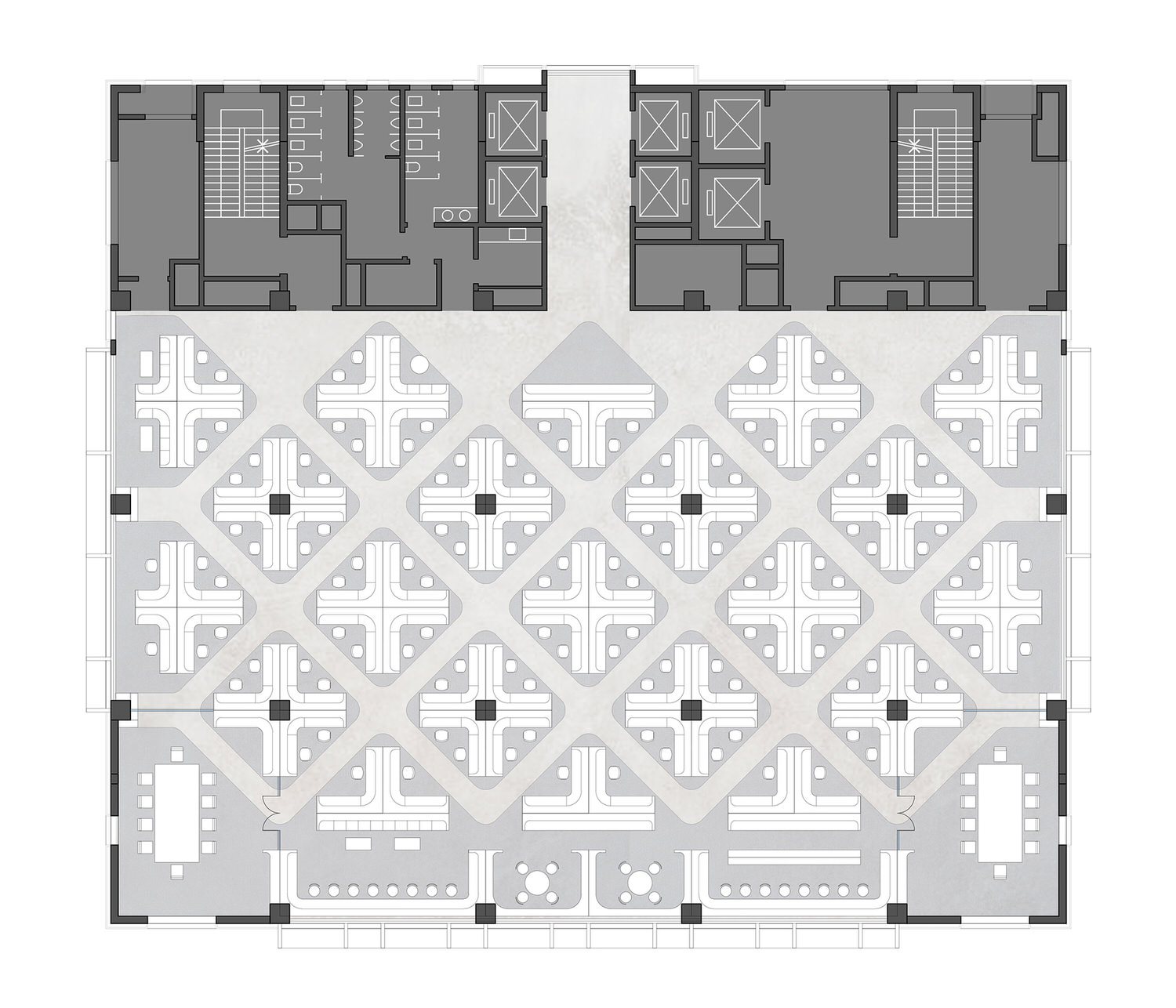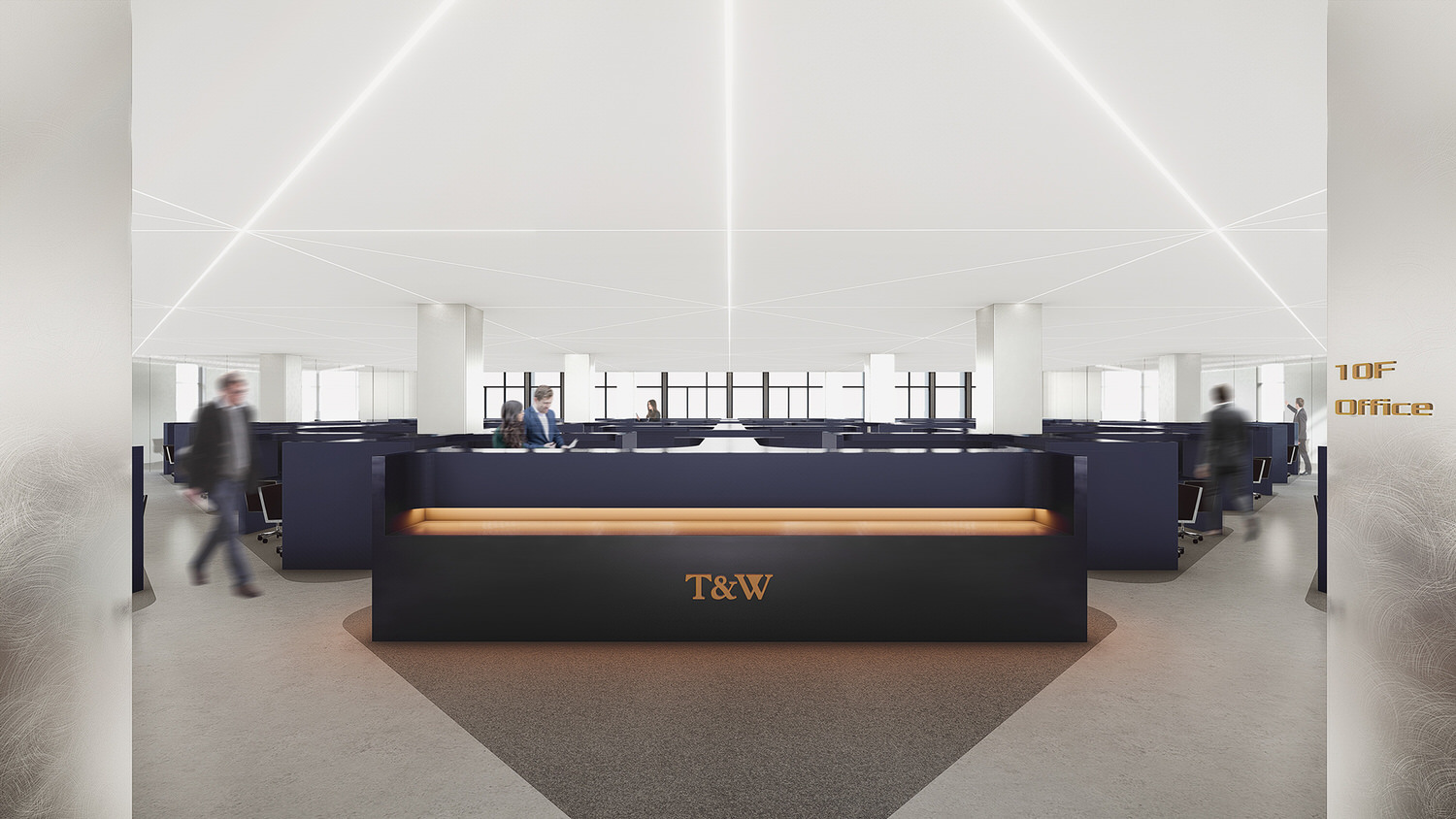 The design is composed of a five-floor open space office area and a two-floor administration office area. The original building plan adopted a regular column network layout, simple and economical. The single-story building area is about 1400 square meters. The interior design scheme layered a 45° spatial structure on the original 90° building plane. The oblique spatial streamline has a dialogue with the original architectural structure, forming a rich visual relationship and adding interest to the spatial experience.