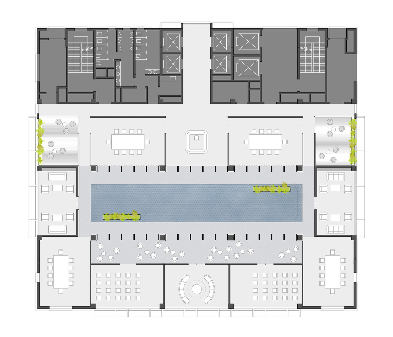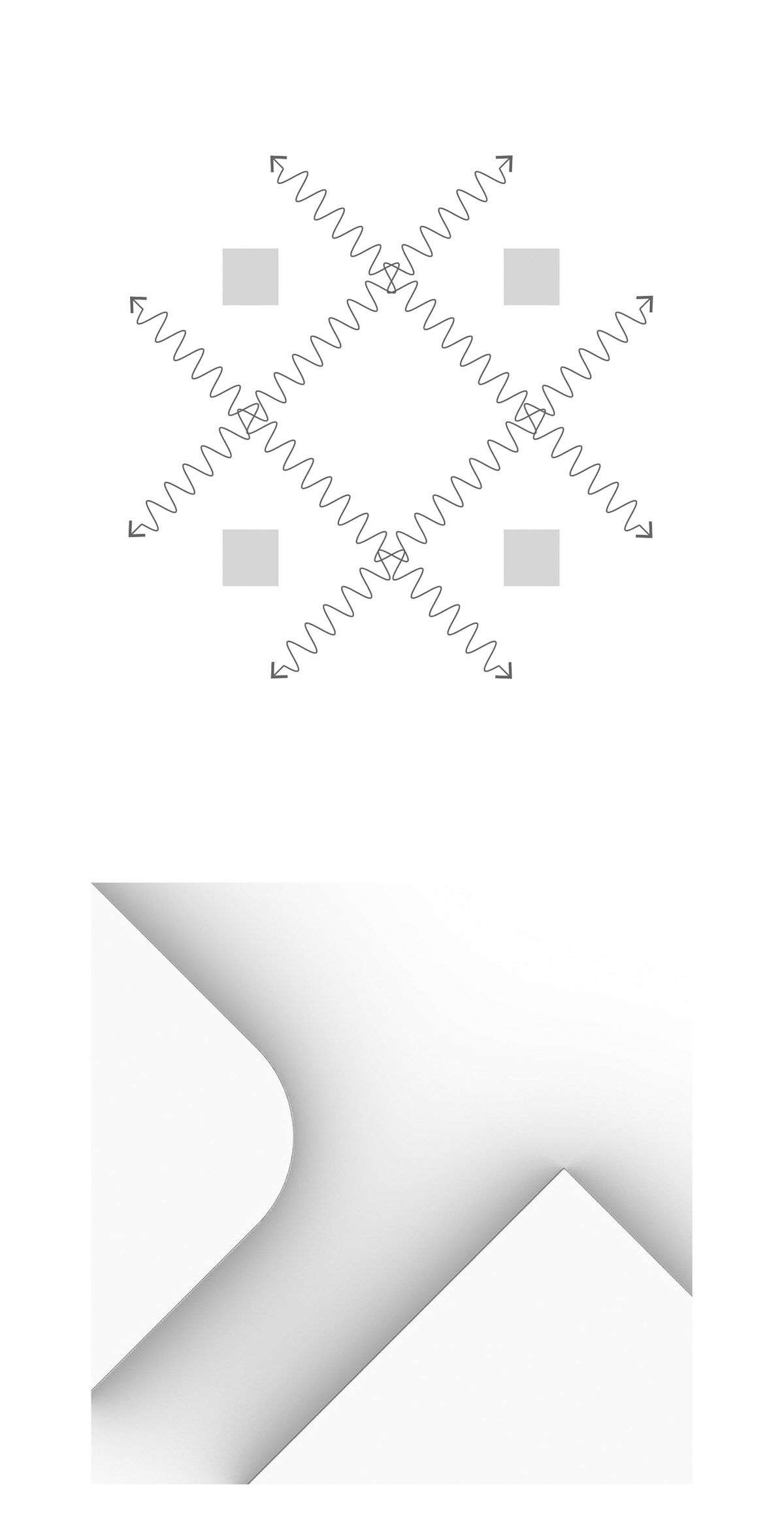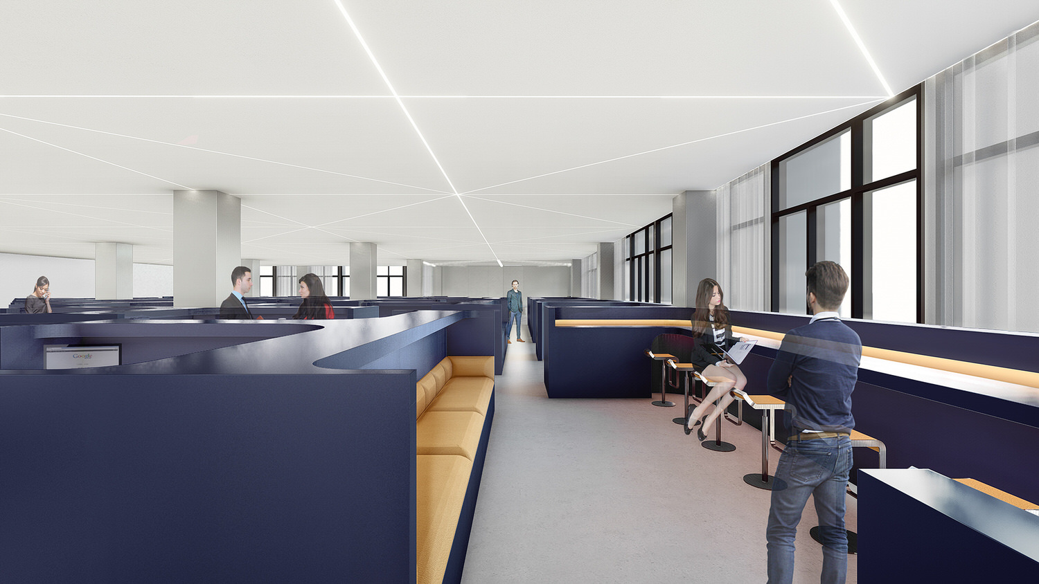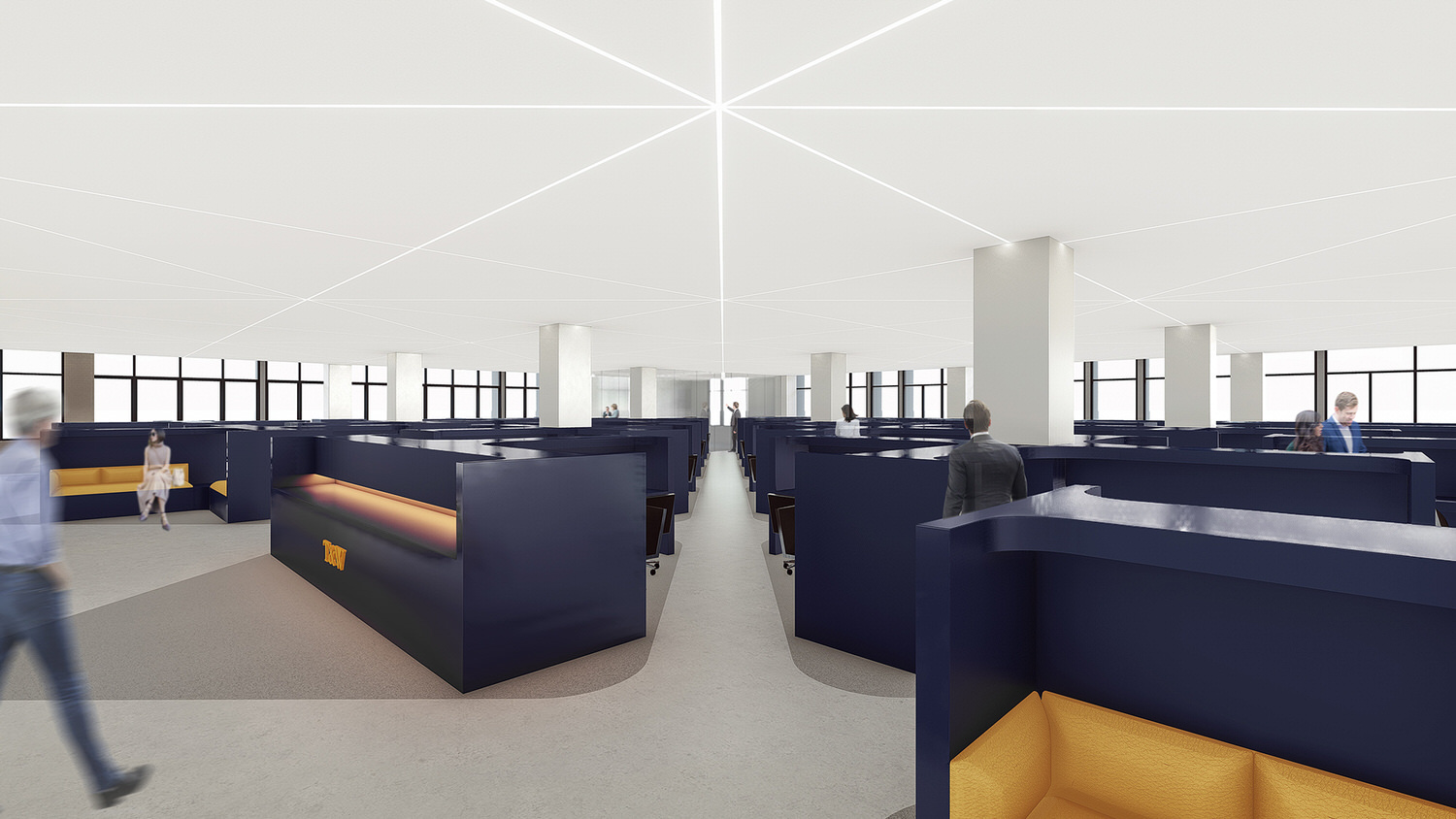 The design is composed of a five-floor open space office area and a two-floor administration office area. The original building plan adopted a regular column network layout, simple and economical. The single-story building area is about 1400 square meters. The interior design scheme layered a 45° spatial structure on the original 90° building plane. The oblique spatial streamline has a dialogue with the original architectural structure, forming a rich visual relationship and adding interest to the spatial experience.