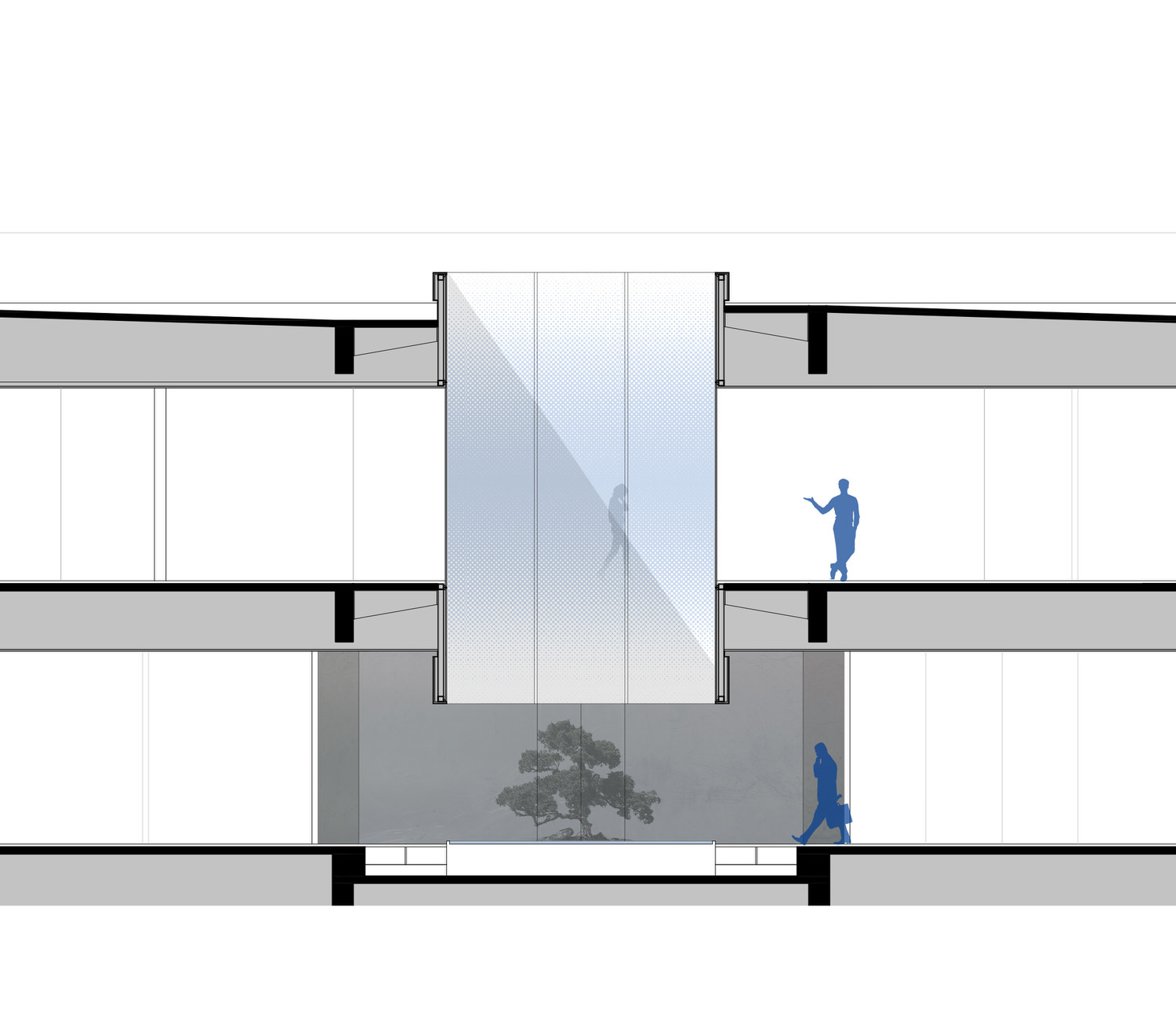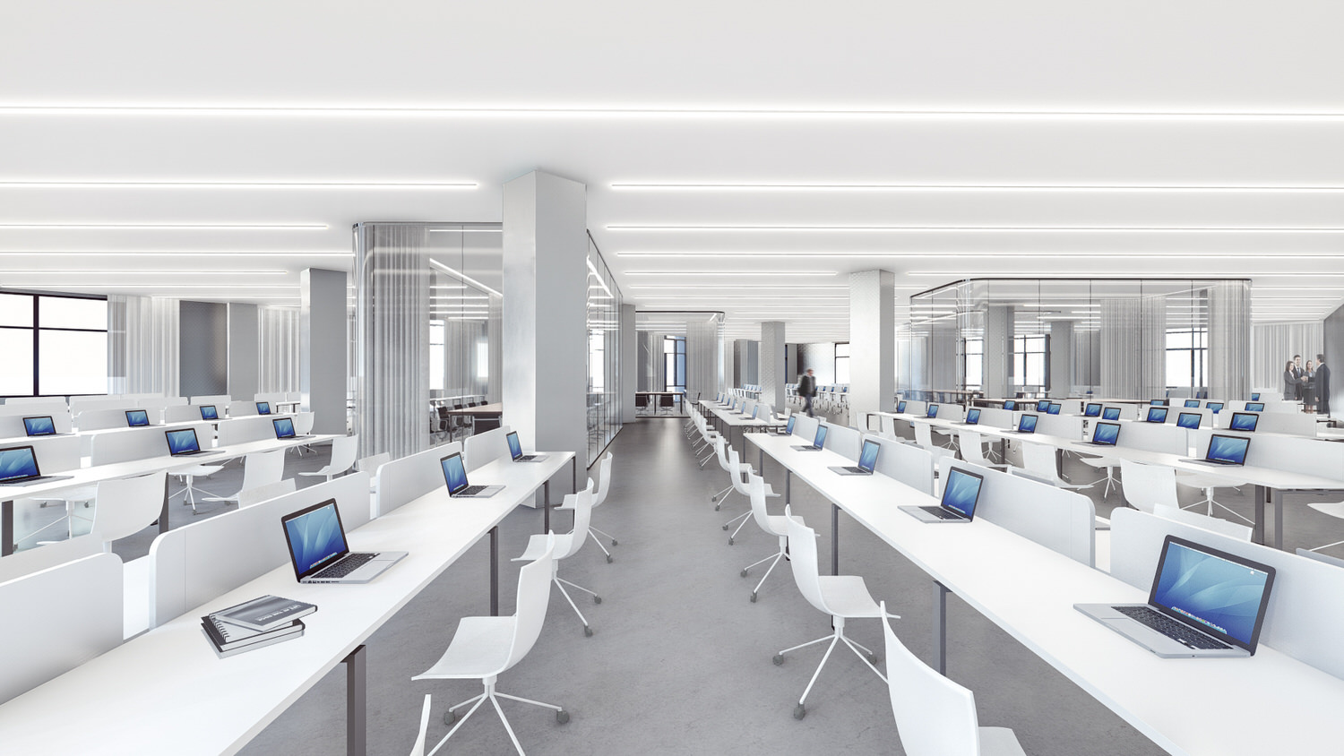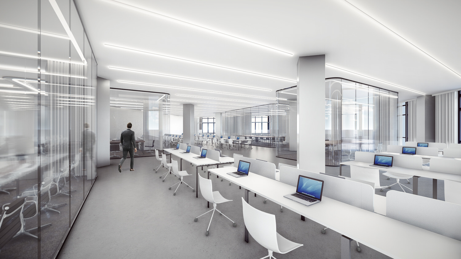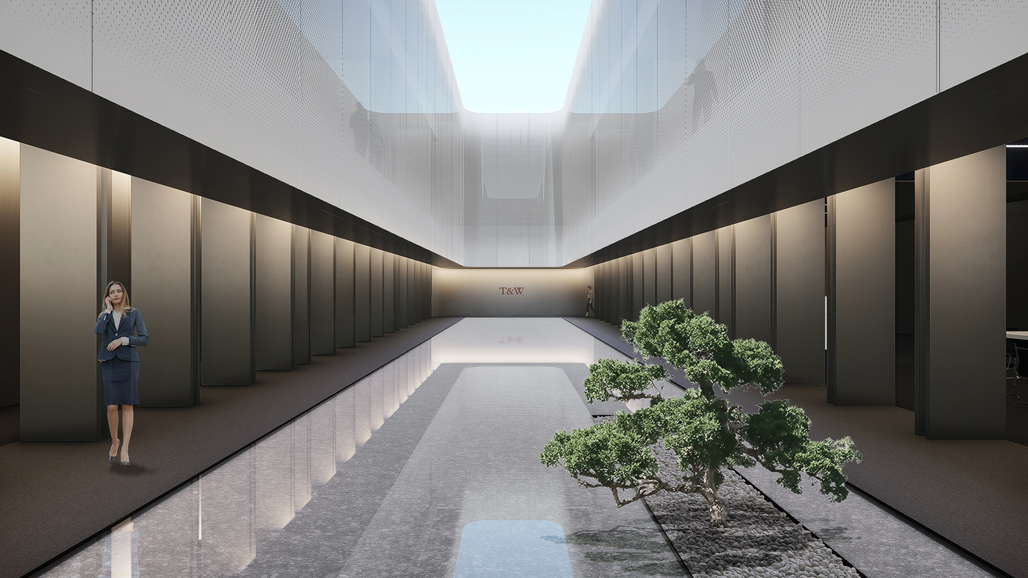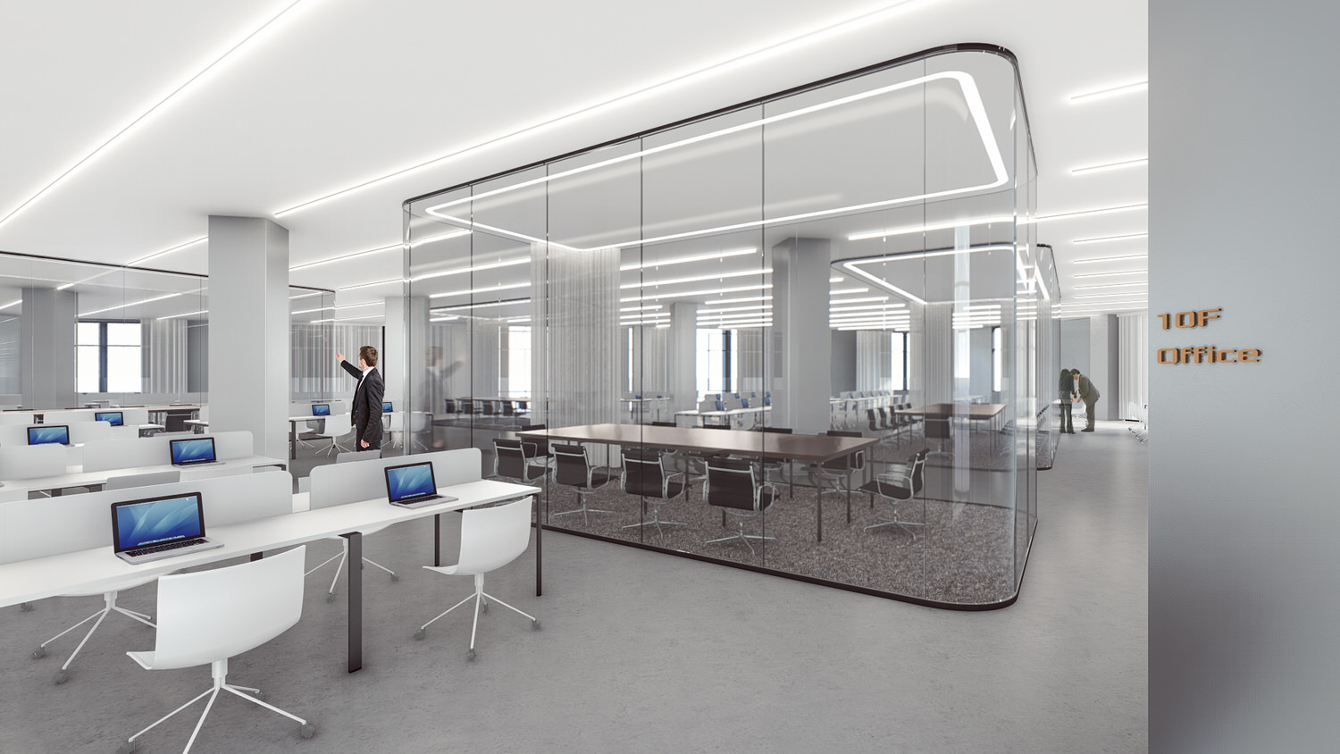 In the interior design, circular arc corner modeling is adopted to enhance the flow and kind of the open office area. The transparent conference room presents the open and democratic working atmosphere of the young technology enterprise. The embedded personal space scheme of the researching stations ensures that each researcher has a relatively private and independent office environment even in a large open space. The administrative office area is located on the top floor of the building, and various offices and meeting rooms are arranged around the lighting atrium in the center, forming a quiet and introverted order.