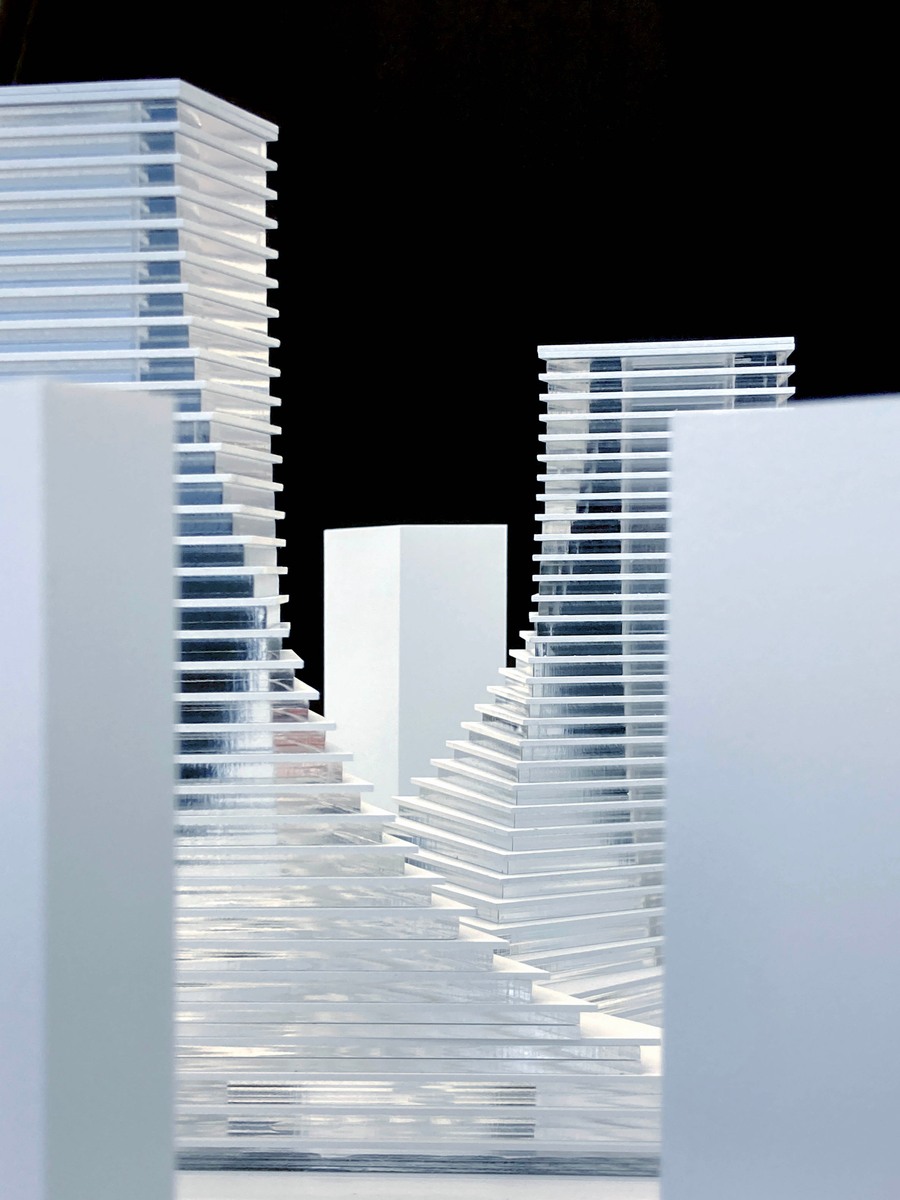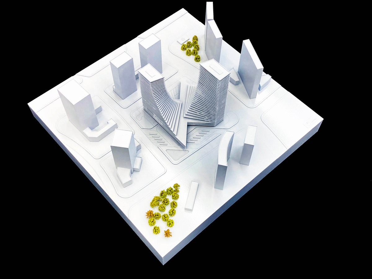 Based on the technical analysis of the road system and traffic technology, the optimal placement of the bus terminal should be at the west side of the site. Currently, the subway station is located on the east side. Naturally, a commercial street is manifested along the flow of commuting passengers that travel diagonally across the site. Positioned on the north and south corners are the two high-rises. The outer edges of the building are parallel to the road, distinctly forming the urban interface. The spiralling of the towers amalgamates the 45 degree intersection between the urban interface and the diagonal commercial street, sculpting the iconic Transport Centre Complex.