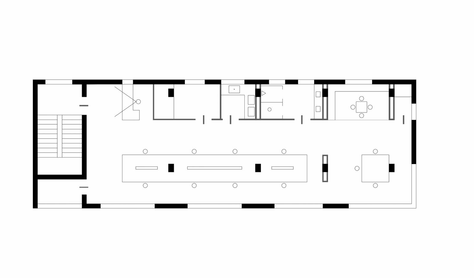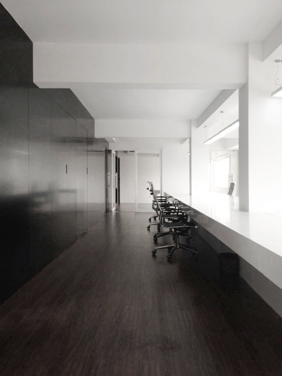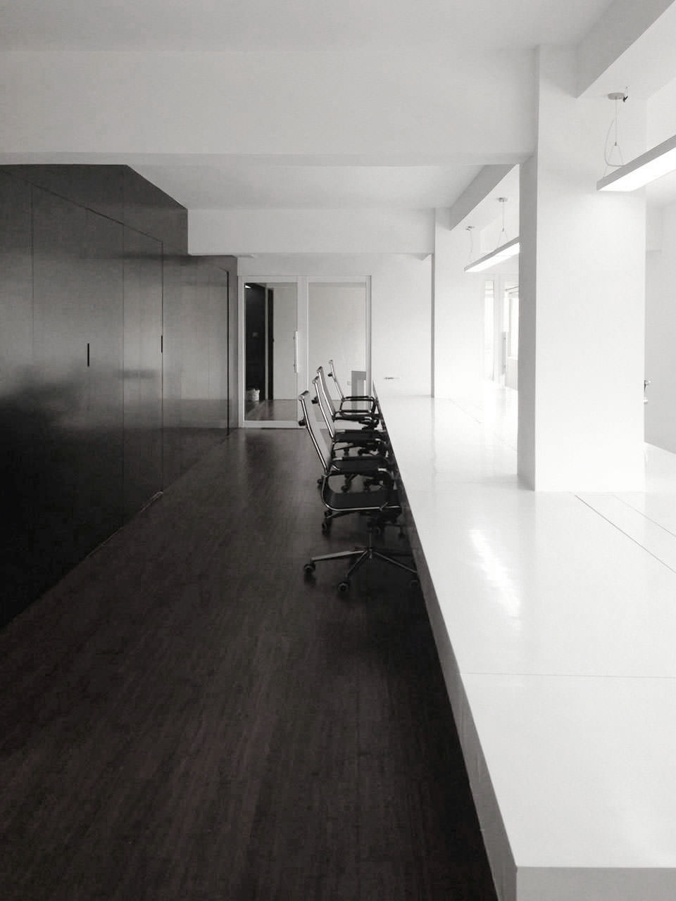 All separation walls were removed so that a large centralized office area came into being. This ca. 70m² large open office area is arranged along southern side of the building whilst a longish ‘black box’ is located along the northern side, in which copy, storage, tea pantry and washrooms are allocated. The eastern and western sides are relatively short. An office front desk is arranged on the former whereas a meeting room is located on the end of the latter. The open office area of 70m² plays an absolutely main role in the space: the whole team works together on a huge working desk spreading along the columns. Together with the beam above, the column in the middle of the table again underlines the centrality of this space. There are no suspended ceilings in the room, so that the exposed beams and columns compose interesting ‘space sculptures’.