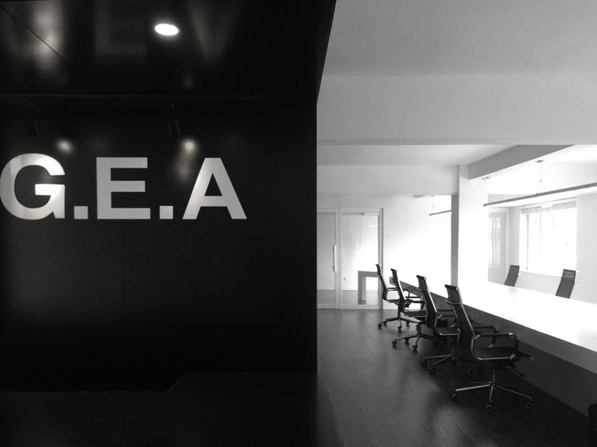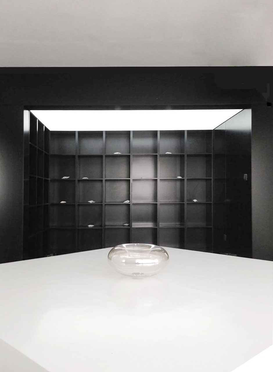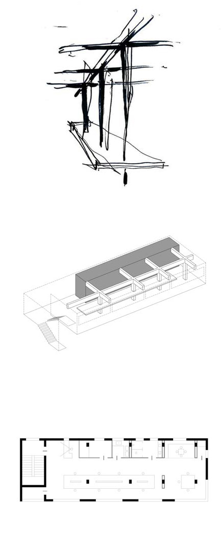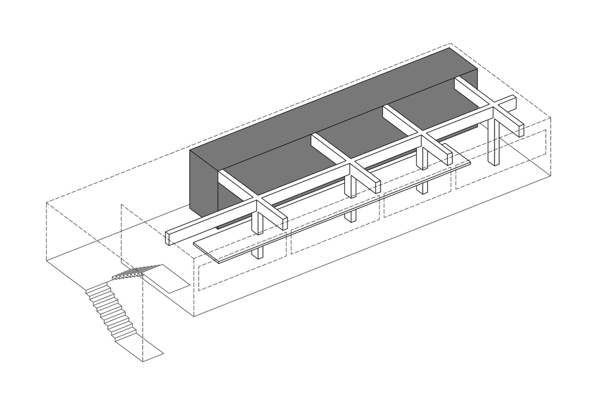 All separation walls were removed so that a large centralized office area came into being. This ca. 70m² large open office area is arranged along southern side of the building whilst a longish ‘black box’ is located along the northern side, in which copy, storage, tea pantry and washrooms are allocated. The eastern and western sides are relatively short. An office front desk is arranged on the former whereas a meeting room is located on the end of the latter. The open office area of 70m² plays an absolutely main role in the space: the whole team works together on a huge working desk spreading along the columns. Together with the beam above, the column in the middle of the table again underlines the centrality of this space. There are no suspended ceilings in the room, so that the exposed beams and columns compose interesting ‘space sculptures’.