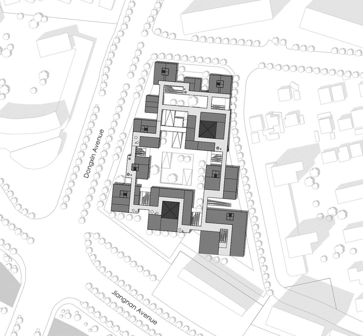 The site is located at the corner of two main roads. Because a metro line under construction runs beneath the site, the metro company planned to build a metro access nearby. Grasping this opportunity, investors intended to build here a commercial complex hosting shopping, recreation and office. This irregular site is an open space framed by surrounding streets and residential buildings. There are several bus stations around, so that residents here usually take the open area as a shortcut to reach their bus. The design not only encouraged this pedestrian shortcut, but also aimed at attracting metro passengers into the site. An open, rather than a closed commercial community was the ambition of architects.